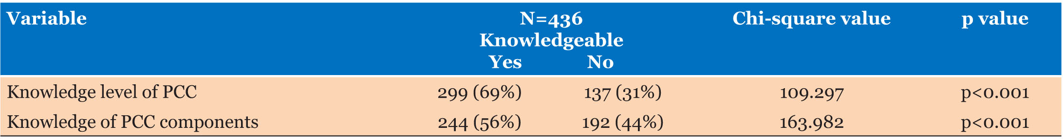 Among the 436 women surveyed, 69% had heard of preconception care, while 31% had not. Of those aware of PCC, 56% knew its key components, such as immunization updates, healthy diet and micronutrient supplementation, chronic disease management, family planning, and avoiding substance abuse, while 44% lacked this knowledge. Key aspects of PCC knowledge included the importance of folic acid and iron supplements, avoidance of teratogenic substances, and seeking preconception counseling. Women identified various negative outcomes of neglecting PCC practices, including miscarriage, birth defects, low birth weight, stillbirth, anemia, etc. Despite this, only 51% of these women reported starting iron-folic acid supplementation (IFAS) at least one month before pregnancy. Chi-square analyses revealed significant associations between both general knowledge of PCC (χ2=109.29, p<0.001) and knowledge of its components (χ2=163.982, p<0.001) with the practice of preconception care (Table 2).