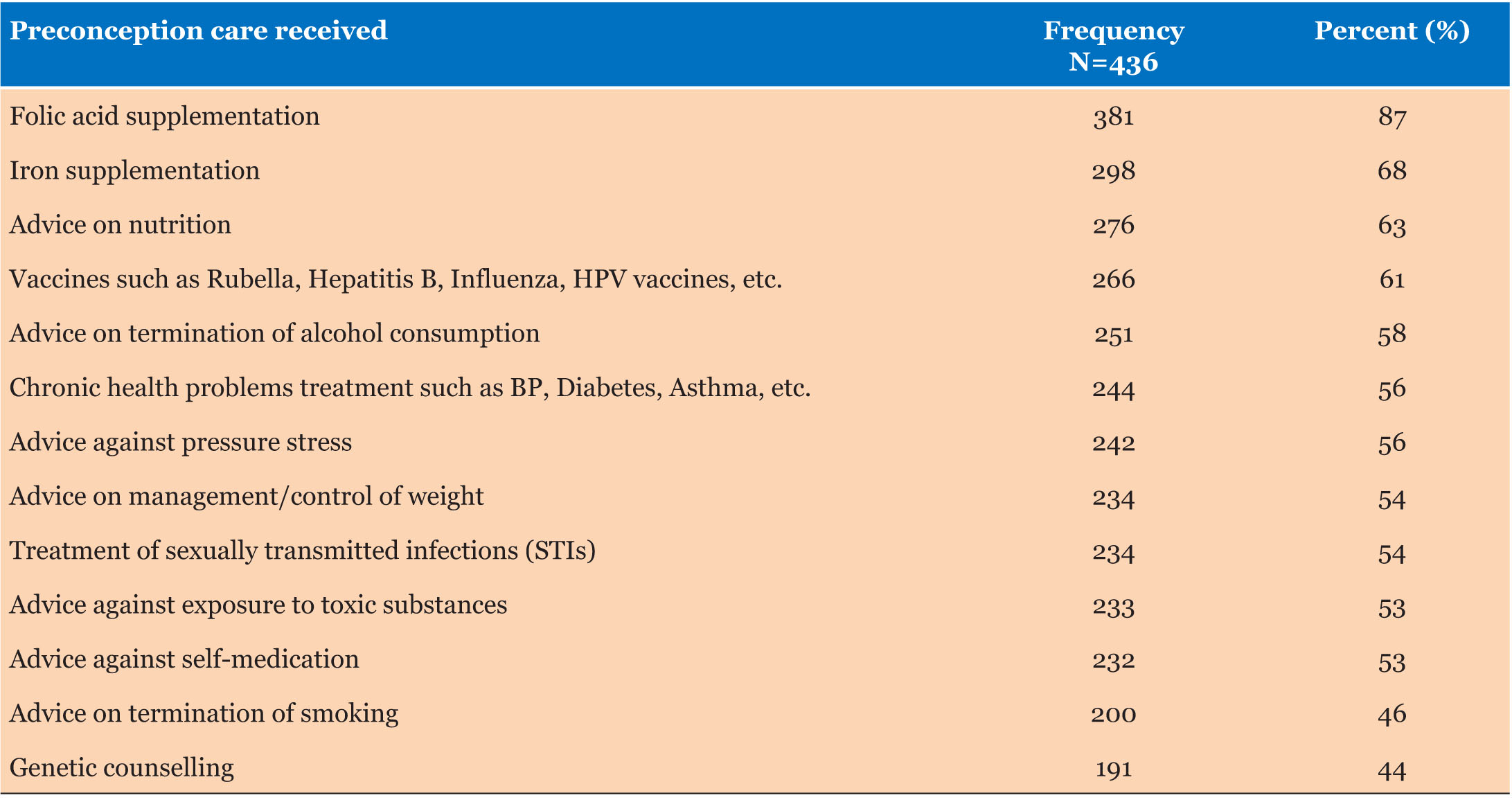 The study tested the following dimensions: knowledge of folic acid and iron supplementations, avoidance of teratogenic substances, awareness of the benefits of preconception counseling, etc.